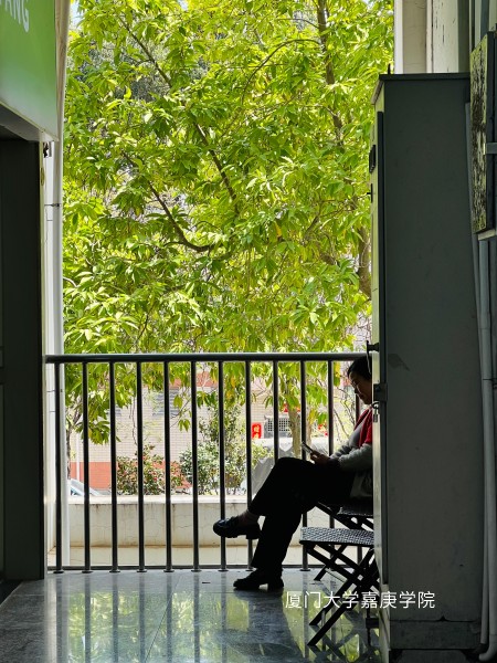 食堂阿姨倚欄小憩,綠葉濾下溫柔光,平凡日常藏著嘉庚學(xué)院的溫度。