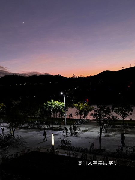 暮色中的至善廣場(chǎng),天空暈染粉紫與橙紅漸變,遠(yuǎn)山如墨,湖水映著天光。廣場(chǎng)上路燈明亮,人影、自行車(chē)錯(cuò)落,靜謐中透著溫馨 。