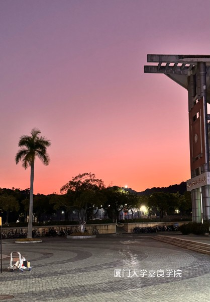 南強(qiáng)廣場(chǎng)旁,粉紫到橙紅的天空如夢(mèng)幻幕布,棕櫚樹(shù)、低矮樹(shù)木剪影錯(cuò)落,建筑線條硬朗,燈光點(diǎn)綴,勾勒出獨(dú)特的黃昏景致 。