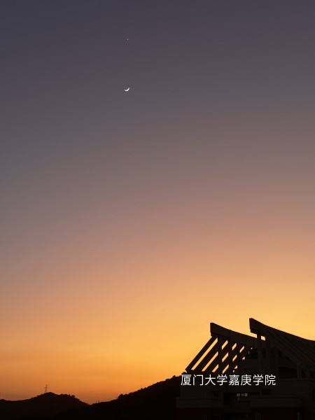 簡(jiǎn)潔的天空視角,從深紫到暖橙漸變,一彎新月懸于天際,凌云一的建筑剪影在橙黃余暉里,盡顯寧?kù)o悠遠(yuǎn) 。