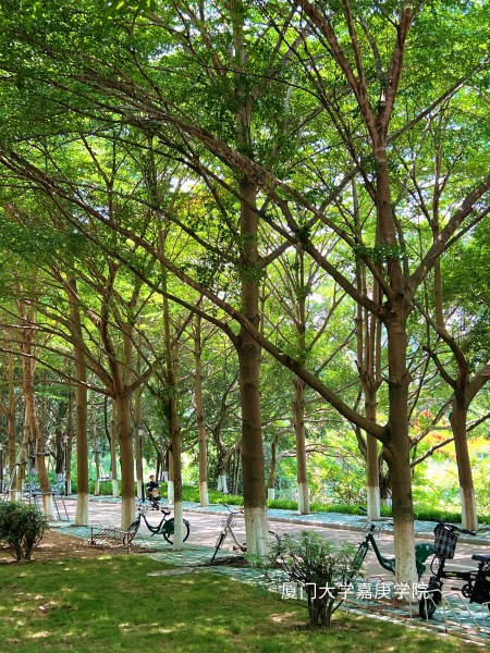 林蔭道上光影斑駁,單車靜靜???,學(xué)子與樹影共享午后的寧靜。