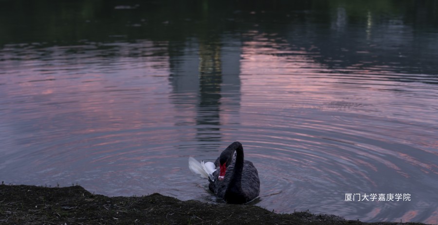 暮色漫染棲霞湖,黑天鵝理羽靜安