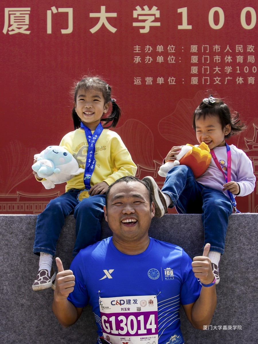 廈馬專項賽公益選手劉玉安與他的兩位“小天使”慕可慕言?!敖o孩子馬拉松式的長情陪伴,如我的參賽號碼,1314,妙不可言?!薄獜B大校友劉玉安
