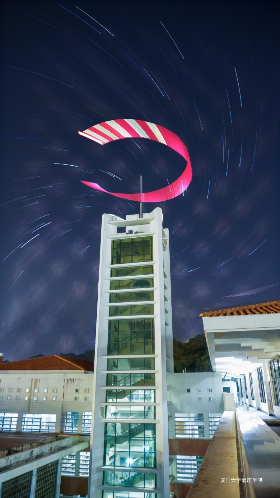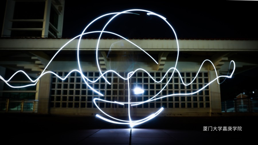 無人機畫出的光繪和星軌在人文樓上映出一副《嘉春山居圖》